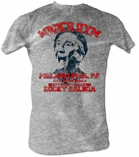 Sign up now, and get your own locker! This officially licensed “Rocky” t-shirt features a very distressed print advertising Mick’s Gym. The text reads, “Mick’s Gym: Eat lightning and crap thunder, Philadelphia, PA. Home of the world heavyweight champion, Rocky Balboa.”
