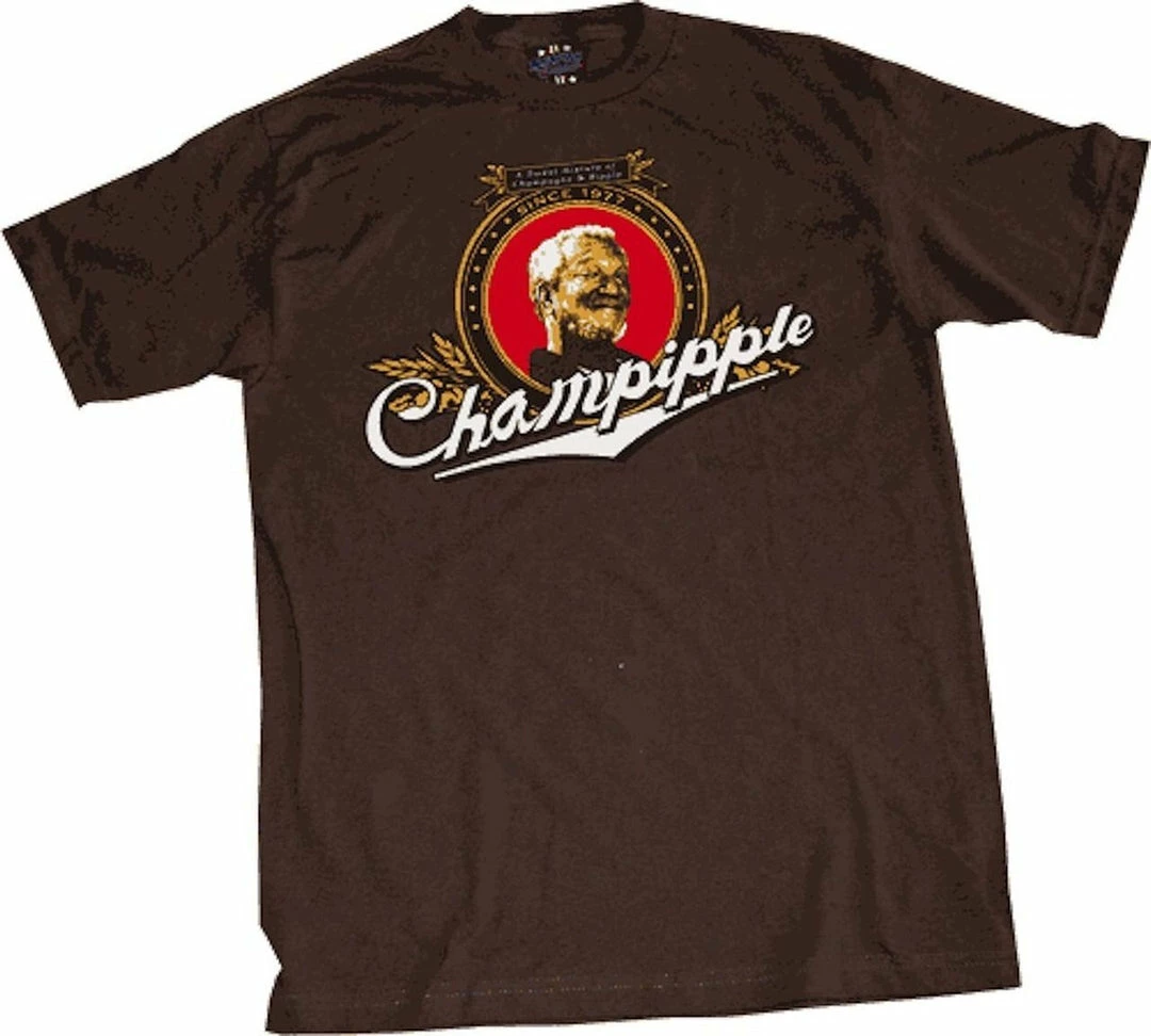 Pay tribute to Fred Sanford’s beverage of choice with this officially licensed “Sanford and Son” t-shirt. The brown cotton tee features a color print of Redd Foxx alongside the text, “Champipple – A mixture of champagne and ripple.” Been sippin’ since 1977!