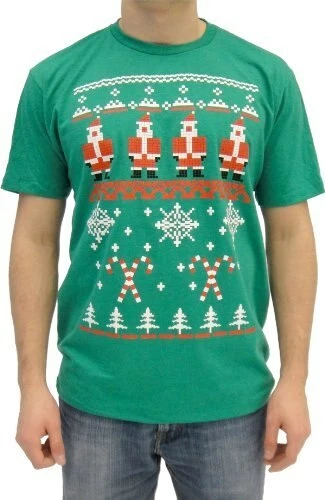 The holidays are always such a special time of year, but they wouldn’t be the same without all those hilariously ugly Christmas sweaters! But what if you’re not into sweaters? Well, we’ve got you covered with our selection of Ugly Christmas t-shirts! Featured here is a design that finds blockhead Santa Claus, snowflakes, candy canes and misshapen Christmas trees all on one horrifying holiday t-shirt.
