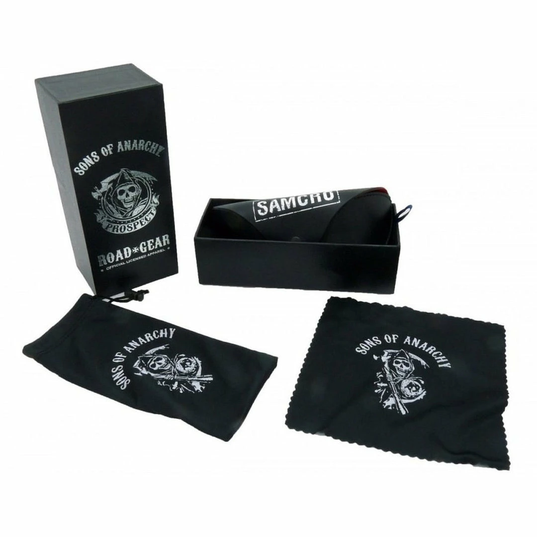- Inclues: 1 Sons of Anarchy cleaning cloth printed with the SOA logo and reaper design, 1 SAMCRO printed leather snap case, 1 Sons of Anarchy draw string pouch printed with the SOA logo and reaper design and 1 Sons of Anarchy hard box case with a Cog Wheel Reaper design