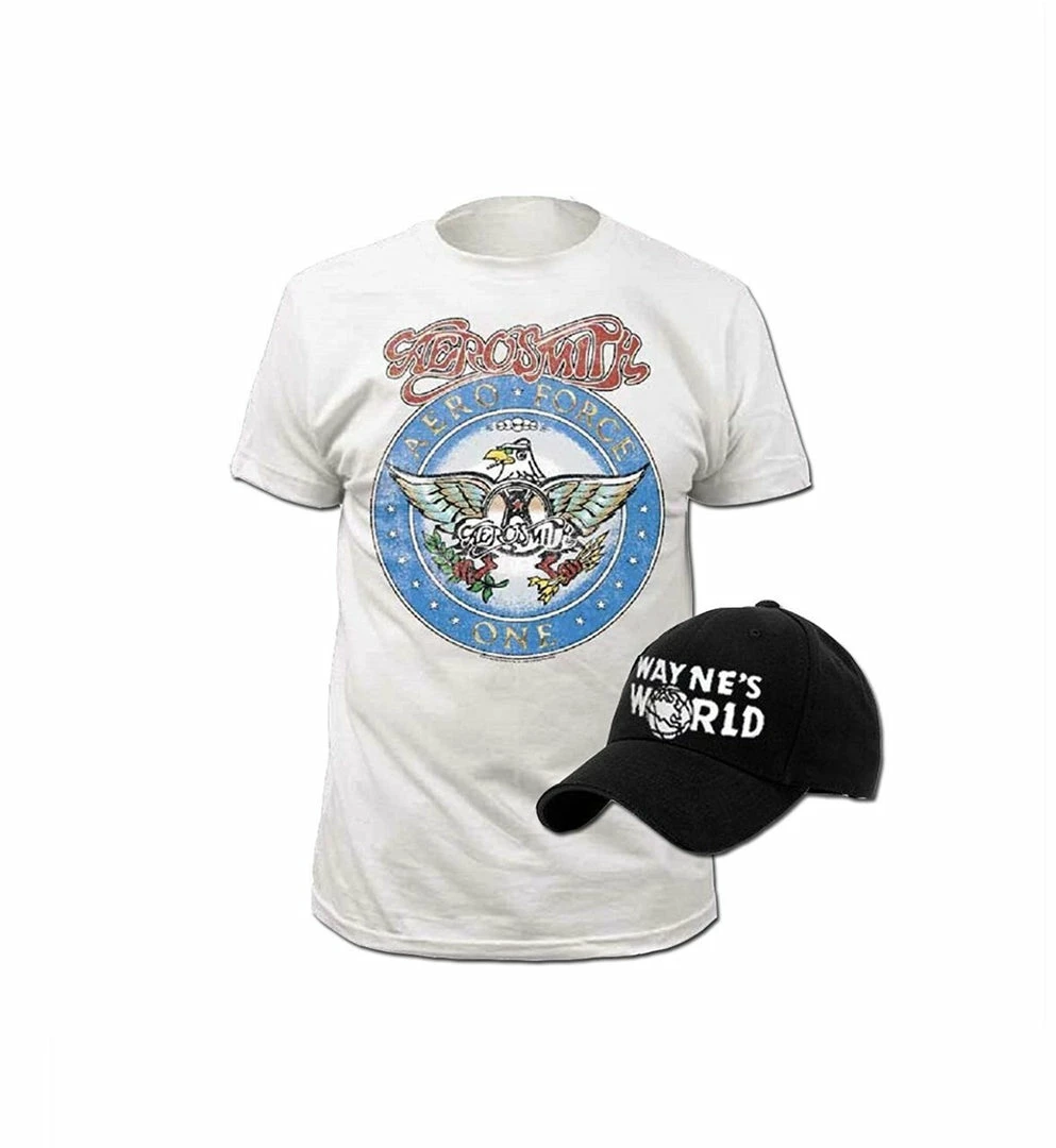 Whether youβre looking for an awesome way to show some love for your favorite band, or you just want a clever reference to your favorite movie, this Aerosmith t-shirt should do the trick! Not only does this Aero Force One t-shirt feature logos from the band, but it was also worn by Garth in the hit movie Wayneβs World! Also includes Wayne’s World hat to complete your very own Garth costume and rock out to some Aerosmith.