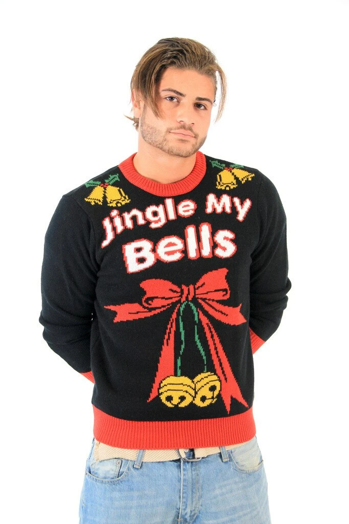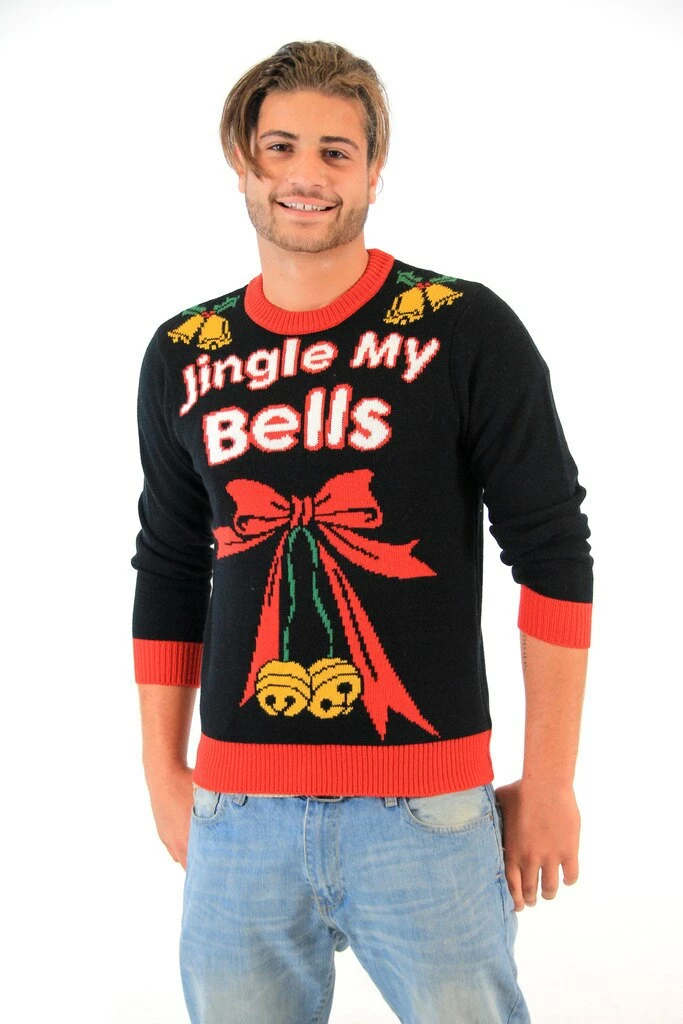 Are you looking for a rude and funny way to spread holiday cheer this winter? If so, perhaps you should keep warm with this hilarious Jingle My Bells sweater! The innuendo is strong with this one. With a black background and not much decoration to speak of, this ugly Christmas sweater is sure to be the talk of any holiday party β and it might even win a few contests! Celebrate Christmas by sharing a few laughs with friends thanks to this humorous holiday sweater.