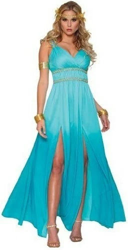 - Includes: A long blue Aphrodite dress, a blonde medieval queen wig, and a wreath headband.