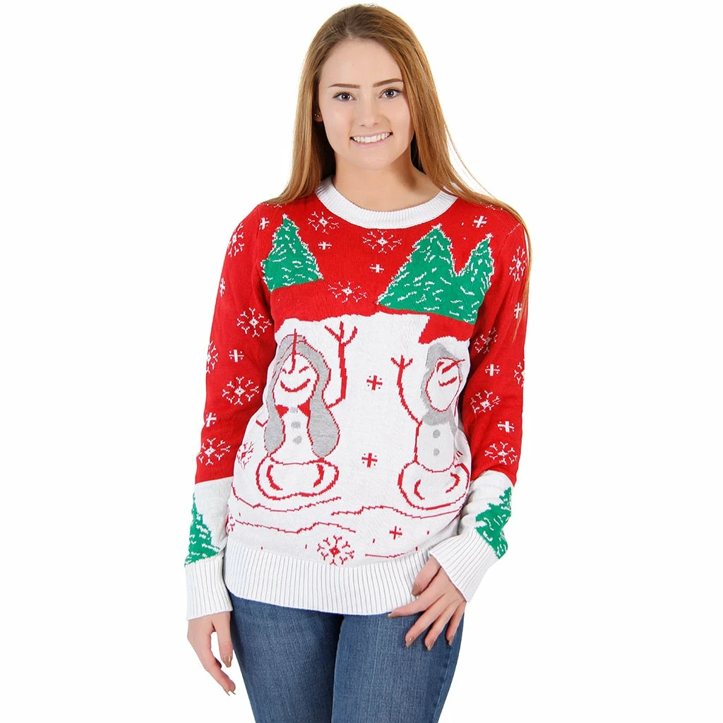 Your aunt with way too much time on her hands made you this ugly Christmas sweater. You got your flashing lights built right in, and not just one snowman, but a snowman and snow-WOMAN. Your forearms will really love those Christmas trees. Coming Soon: Christmas humping version. (not really)