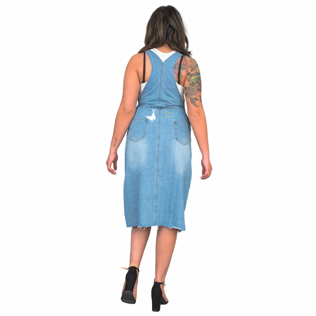 - Includes an adult womens denim Overalls with embroidered flowers and butterflies. Does not include anything else.