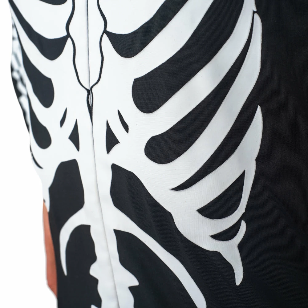 - Costume includes a zip up one piece black jumpsuit with your choice of glow in the dark or white ink skeleton print. Does not include anything else.