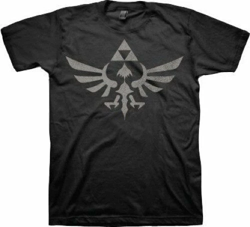 Nintendo games never looked so sexy! This sleek black “Legend of Zelda” t-shirt features an image of the Twilight Princess Triforce logo. The print has been distressed for vintage appeal.