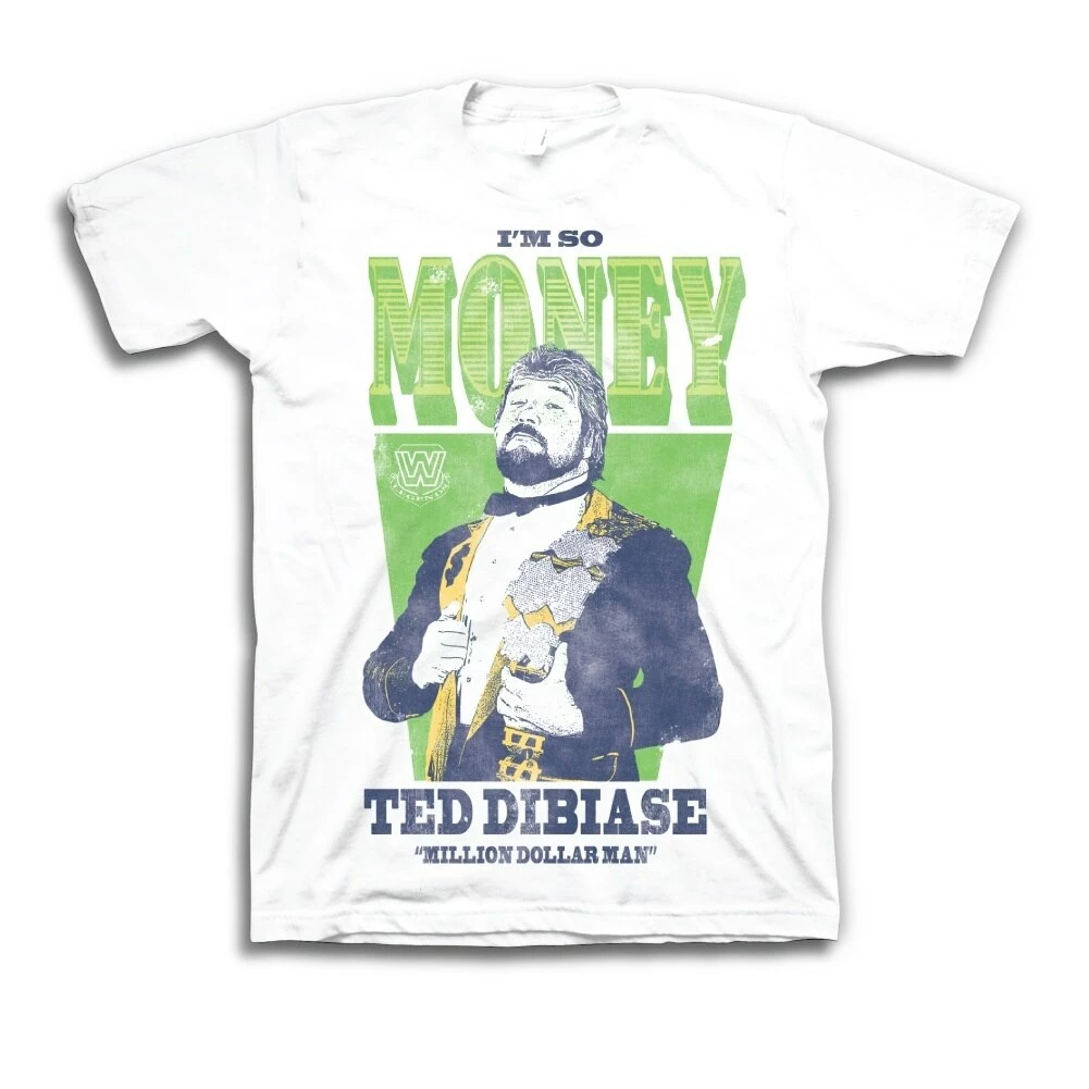 Do you remember the opulent tastes of professional wrestler Ted DiBiase? If so, why not show it off with style? This officially licensed WWE t-shirt features Ted with the tagline βIβm So Money,β making it an excellent choice for any long time fan of the WWE. Let the world know who your favorite wrestler is with this awesome Ted DiBiase t-shirt! Show some love for the Million Dollar Man with this retro WWF t-shirt.