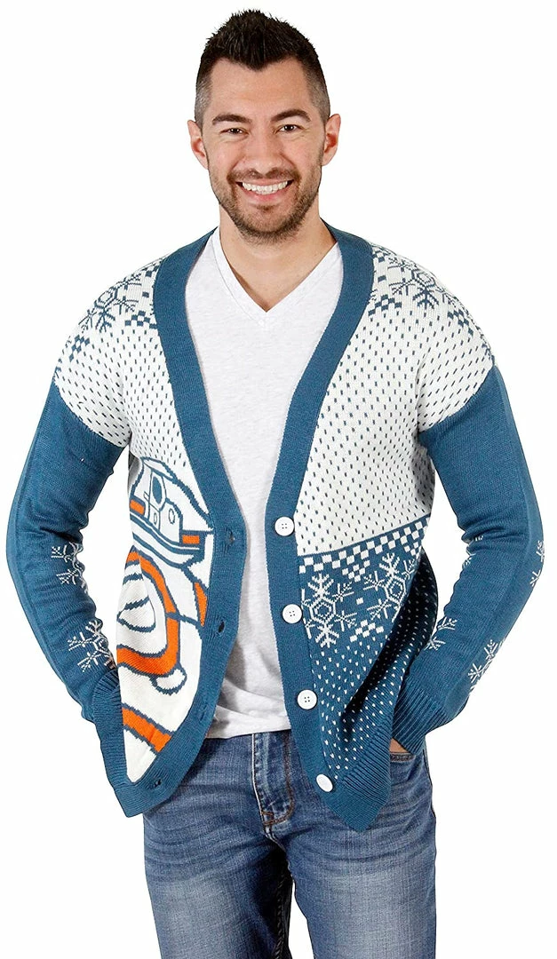 Whether you love the new Star Wars or dislike it there is one aspect of the new movies that you can’t deny: It’s that BB8 is cute, loveable and charming. This is why we’ve created this officially-licensed BB8 Ugly Christmas Cardigan Sweater. Knitted and on the verge of being more than an ugly Christmas sweater, but actually a fashionable, and hipster’s loveable cardigan, this BB8 Star Wars ugly Star Wars Christmas sweater will make you the hit at your next work Christmas party or family festive holiday gathering.