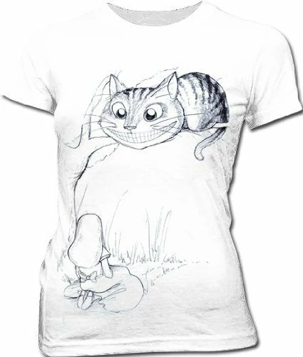 You’ve likely seen a cat without a grin before, but have you ever seen a grin without a cat? If you stare at our 100% cotton Cheshire Cat t-shirt long enough, you just may! This white juniors tee depicts Alice and the vexing, smiling cat from Lewis Carroll’s “Alice in Wonderland.” If you like it, you may want to order fast– you never know when it may disappear!