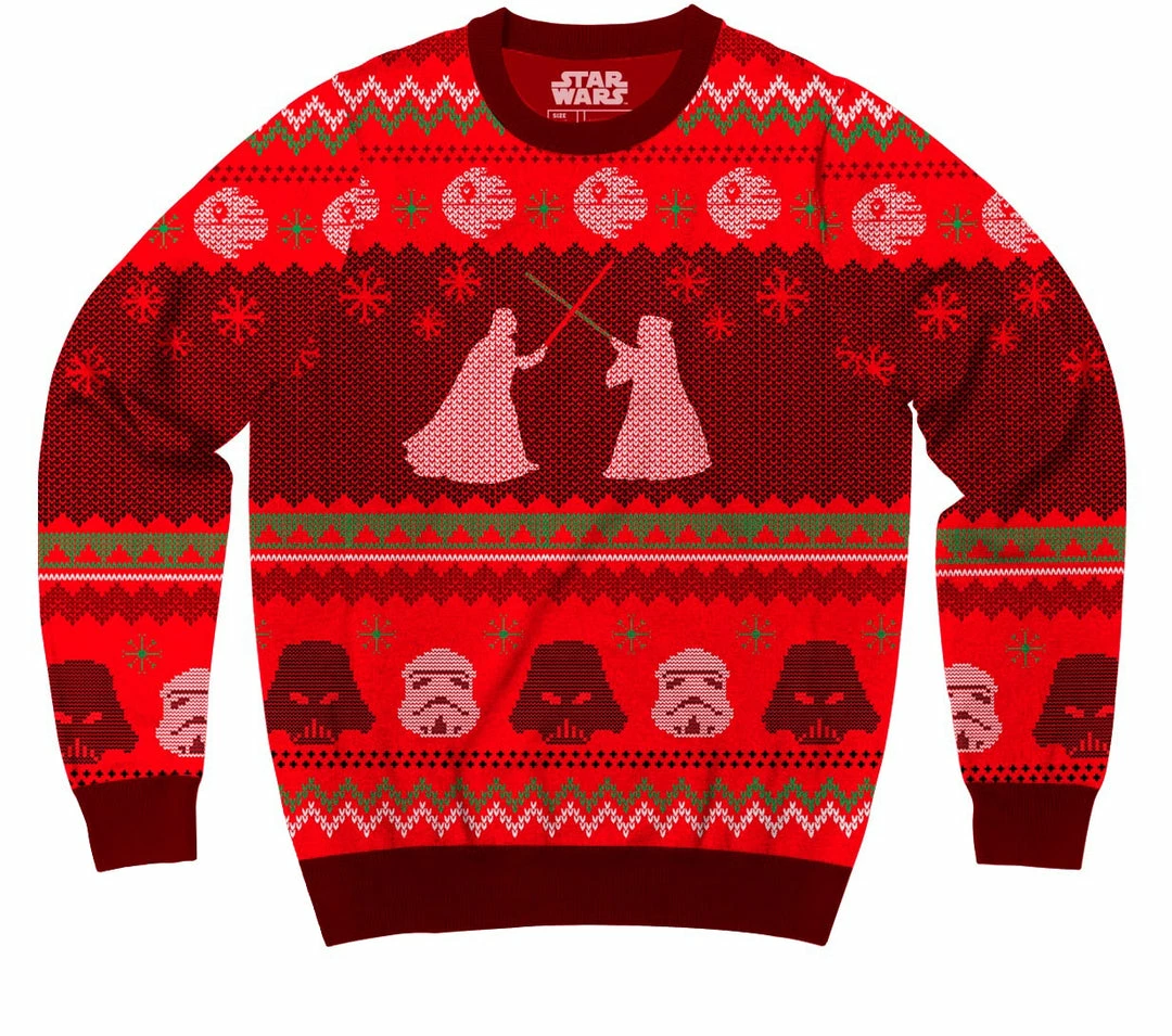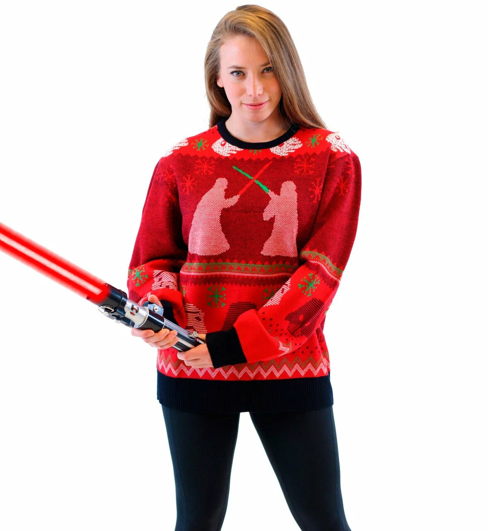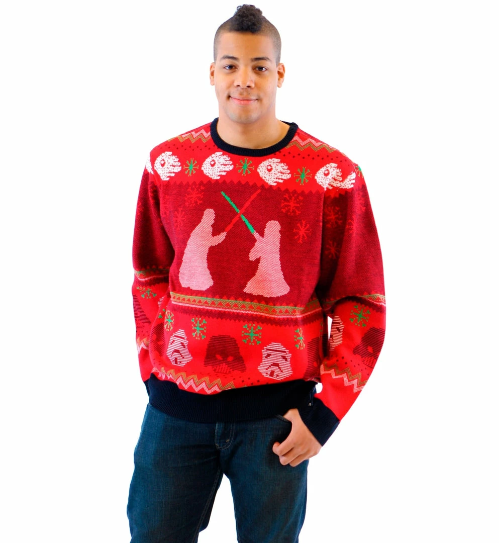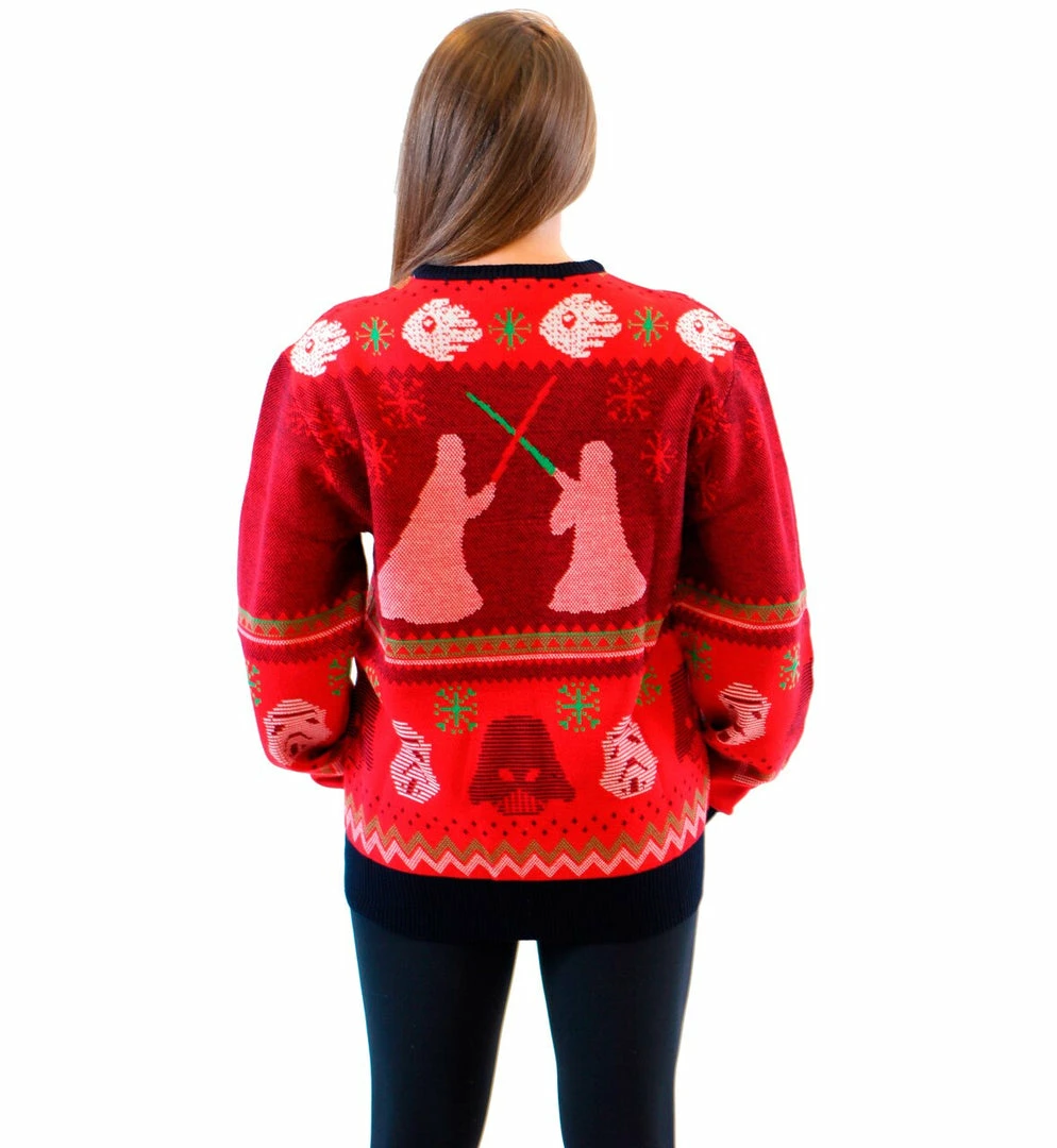 Are you looking for a holiday sweater that will help you show some love for your favorite science fiction franchise? Well, that seems like an odd request, but we can definitely help with this officially licensed Star Wars sweater! Featuring a silhouette of Darth Vader and Obi-Wan Kenobi, this oddly themed Xmas sweater is perfect for any Star Wars fan. Celebrate the holidays in style with this fun and geeky ugly Christmas sweater!