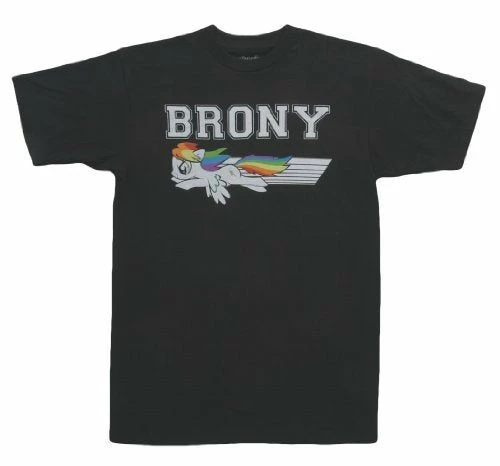 Nothing says Brony more than this officially licensed My Little Pony Brony Swoosh Color Black Mens T-shirt. It’s a fun shirt to have in your MLP collection as one the front of it there is a hybird pony that is part Rarity and part Rainbow Dash. Nothing states your love for the Ponies more obviously then this 100% Cotton t-shirt. Available in Adult Sizes only.