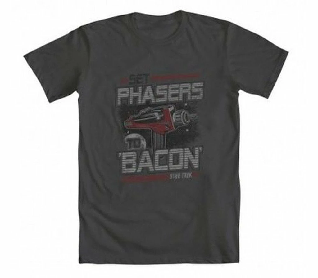Why do they always set phasers to stun? Why not set phasers to bacon? After all, this delicious meat is awesome! If you’re a fan of the much beloved sci-fi classic Star Trek, why not show it off in a fun and humorous way? This officially licensed Star Trek t-shirt features a phaser weapon which can apparently be set to pork products, which is definitely an amazing concept. If you’re a fan, let the world know about your geeky obsessions with this hilarious Set Phasers to Bacon t-shirt!