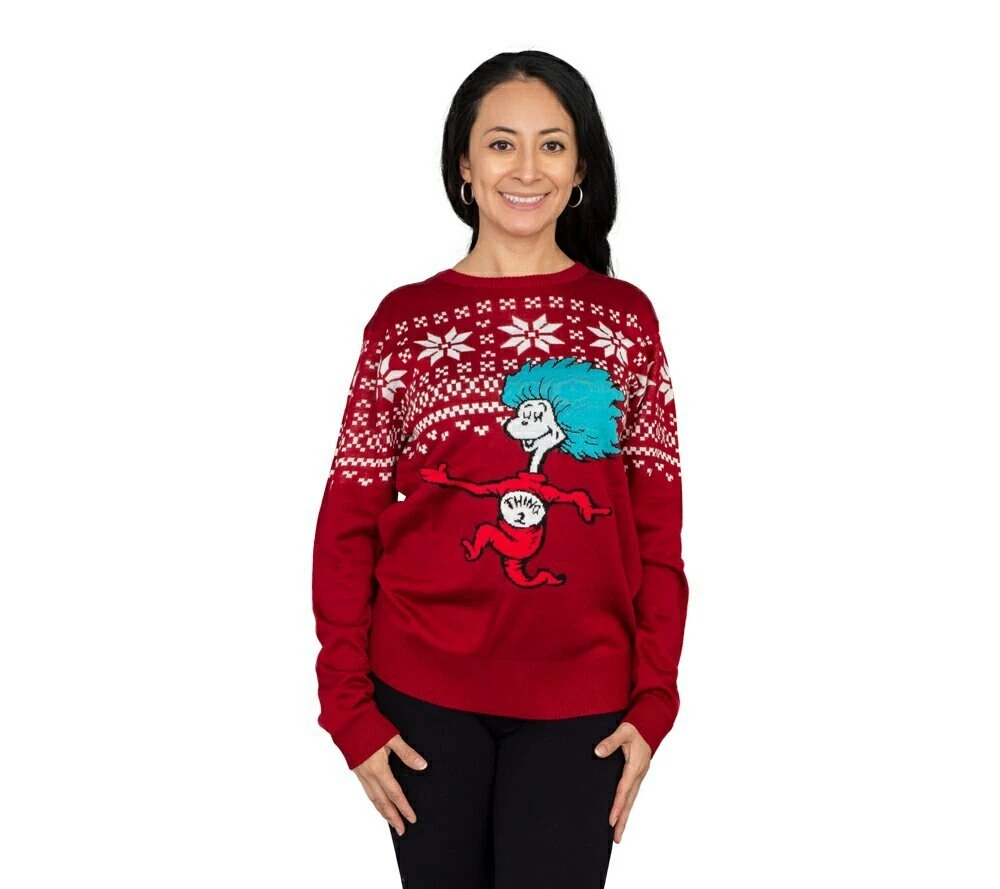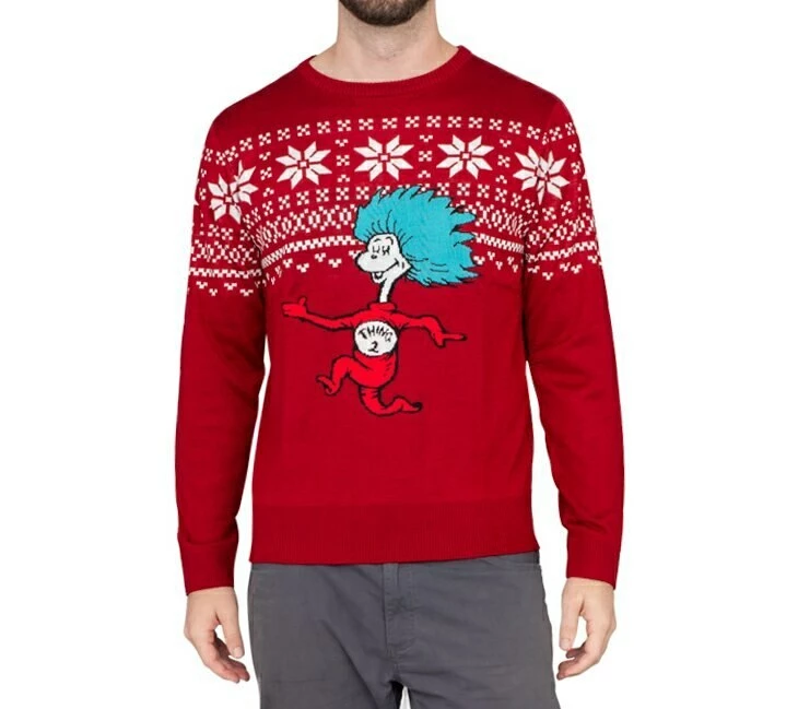 Are you thing 1? No, youβre definitely thing 2! Let everyone at the Christmas party know that youβre a fan of Dr. Seuss with this funny and ugly holiday sweater! Featuring one of his most well known characters, this officially licensed Dr. Seuss sweater is perfect for any fan. With a simple snowflake border along the top, this Thing 2 sweater is sure to be a contender for any ugly Christmas sweater contest!