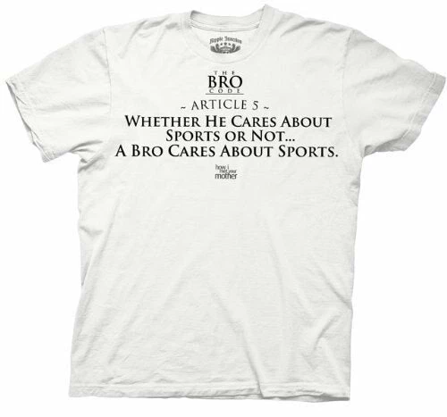 Bro code! Mediate gentleman’s disagreements within your own social fraternity using this officially licensed “How I Met Your Mother” t-shirt. The white cotton tee features an elegant print of Barney Stinson’s Article 5: “Whether he cares about sports or not… a bro cares about sports.” Words of wisdom, we believe you’ll agree. Order now!
