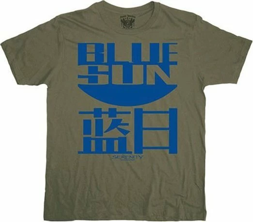 The unmistakable English/Chinese logo of the mysterious, ubiquitous Blue Sun Corporation appears on the front of this officially licensed “Serenity” t-shirt. The power of this packaged foodstuffs producer rivals that of the Alliance itself!