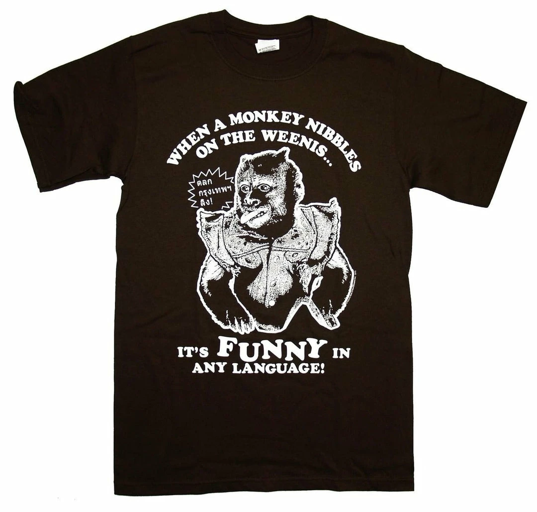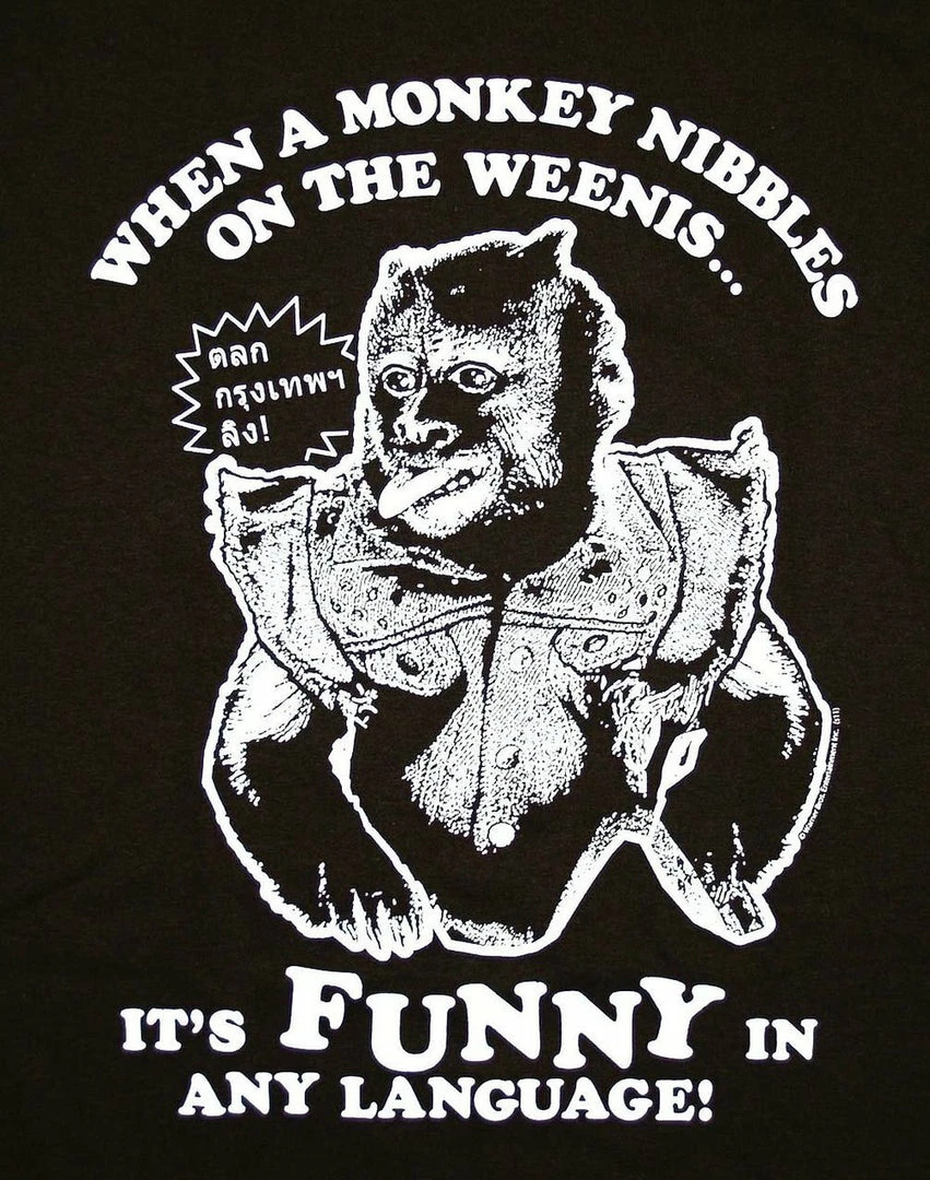 There’s no monkey business with this dealing monkey! “When a monkey nibbles on the weenis, it’s funny in any language!”