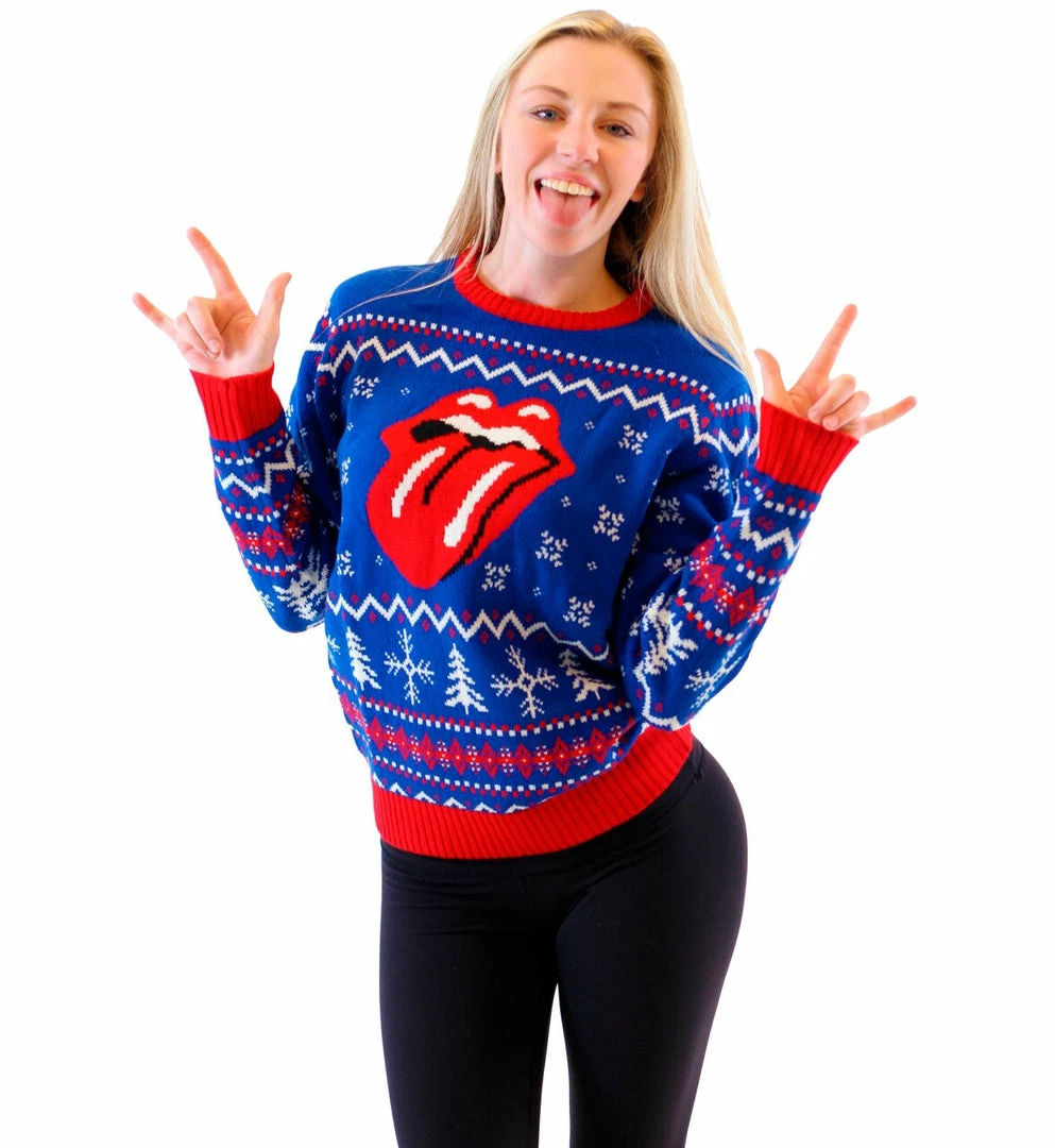 Few bands can rock your holidays as hard as the Rolling Stones! If youβre looking for a unique and questionable holiday sweater to help you spread some holiday cheer, this officially licensed Rolling Stones sweater will give you plenty of excuses to break out singing βGimme Shelterβ for pretty much no reason! Featuring a random pattern of Christmas trees, snowflakes and the Rolling Stone logo, this ugly Christmas sweater would make an excellent contender for any contest at a holiday party!
