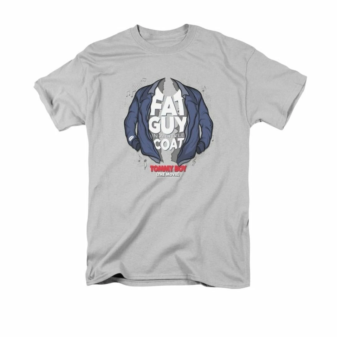 If youβve ever found yourself singing this catchy song from the classic comedy Tommy Boy, this hilarious Fat Guy in a Little Coat t-shirt is sure to please. Featuring the simple lyrics to the song, this officially licensed Tommy Boy t-shirt is sure to make fans laugh. Let the world know what happens when a fat guy puts on a little coat with the help of this nostalgic and memorable Tommy Boy shirt!