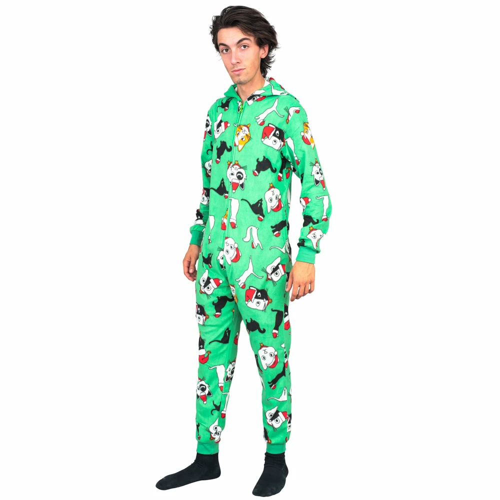 TVStoreOnline Christmas Cat Pajamas Cozy Fair Isle Union Suit Adult Green Jumpsuit