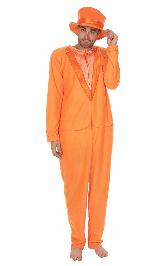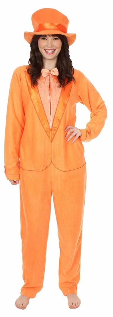 Lloyd Christmas had an amazing sense of style, which is why he chose to show up to the party dressed in a fancy orange tuxedo! If youβve ever been jealous of Lloydβs fashion sense, these officially licensed Dumb and Dumber pajamas might just be right up your alley. With a classy hat included, now you can look fancy and ready to party no matter where you are β even if youβre just heading to bed! Celebrate your favorite movie in style with the help of this awesome tuxedo pajama set.